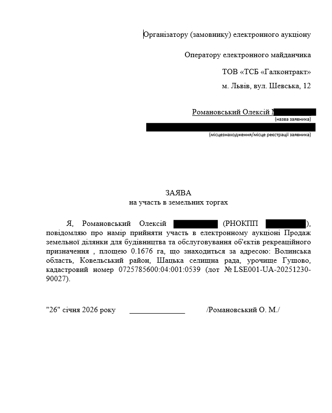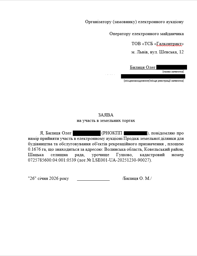 Участь в аукціоні взяли двоє волинян: Олексій Романовський, який прийшов з початковою ставкою мільйон 40 тисяч гривень, та Олег Билиця, який запропонував на 10 тисяч більше, а тому дістав право пропонувати ціну останнім. У першому раунді Романовський підняв ціну на 10 тисяч, після нього на 11 тисяч підвищив свою ставку Билиця. У наступних двох раундах їхні пропозиції не змінювалися. Тож у підсумку Шацька селищна рада 23 лютого 2026 року підписала договір про продаж землі за мільйон 61 тисячу гривень із Олегом Билицею. Під час торгів стартова ціна зросла лише на 40 тисяч гривень.