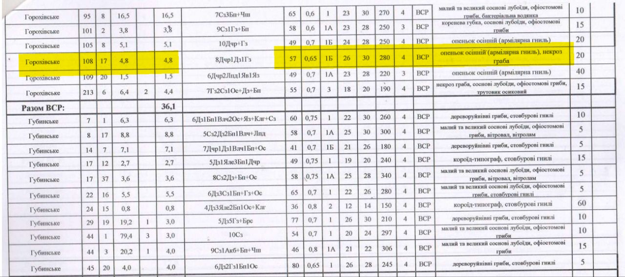 Головний документ – лісорубний квиток, який фактично є дозволом на проведення санітарної рубки, на основі всіх цих документів видала головна спеціалістка відділу лісового господарства Північно-західного міжрегіонального управління лісового та мисливського господарства Людмила Ковальчук. Таким чином під вибіркову санітарну рубку потрапила територія площею 4,8 гектара Горохівського лісництва. Усього планували заготовити 254 кубометри деревини.