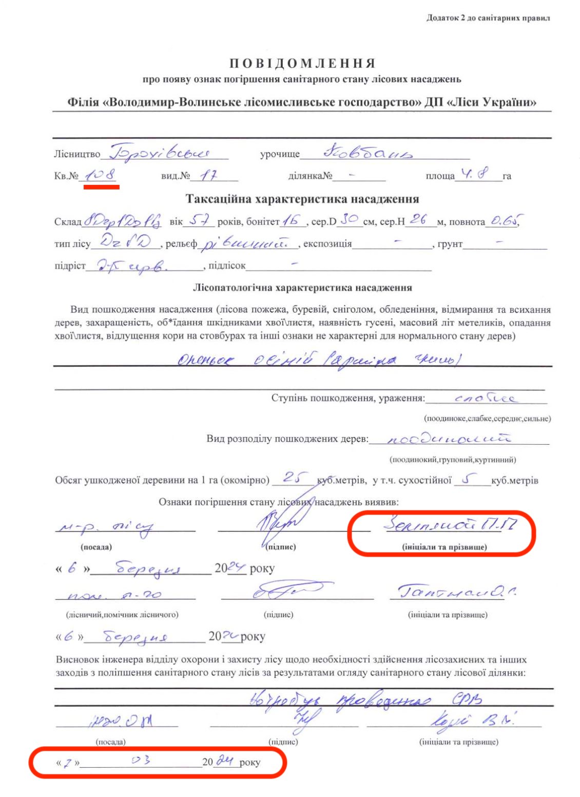 Санітарну вибіркову вирубку у 17-му виділі 108 кварталу в урочищі Ковбань Луцького району розпочали у травні 2024 року. Згідно повідомлення про погіршення санітарного стану, ознаки захворювання на деревах цьогоріч у березні виявив той самий майстер лісу Павло Земляной, з яким спілкувалися на місці вирубки. А підписав – помічник лісничого Олег Галтман, якого застали у лісництві.