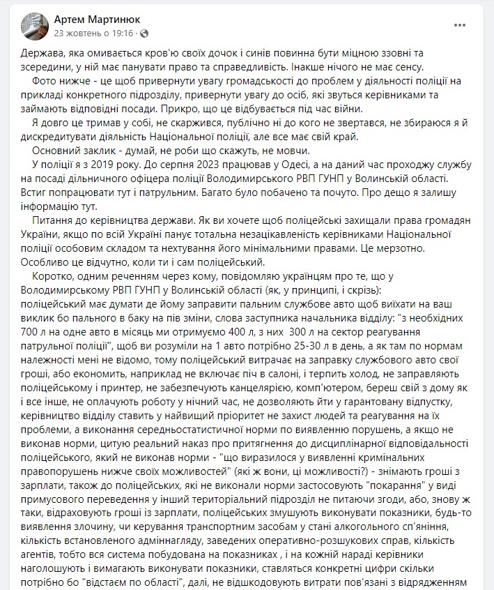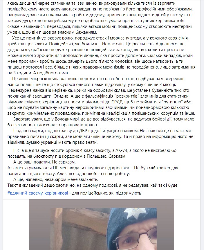 У дописі чоловік згадав і про ситуації, які з ним траплялися уже на Волині, і про ситуації із роботи в Одесі. З його слів, зі своєї кишені правоохоронцям із райвідділку доводиться доплачувати за пальне для автівок, бо його часом видають на пів зміни, ремонтувати авто і дбати про ремонти проривів труб на поліцейській дільниці, просити у підприємців папір для принтера, наповнювати аптечки, підвозити дітей начальника до школи, а між тим не забувати про планові показники виявлення порушень.