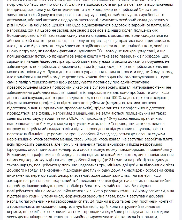 «…ремонт службових авто здійснюється за кошти поліцейського, який на ньому патрулює, як наслідок фактично нульового ТО – авто у не найкращому стані, а ще поліцейському потрібно придбати за власні кошти у таке авто павербанк з проводом, щоб зарядити планшет/відеореєстратор, щоб мати змогу надати людям докази їх порушень, не забезпечують поліцейських форменим одягом (одностроєм), якщо поліцейський хоче, він може сам поїхати у м. Луцьк до головного управління та там попросити видати йому форму, але приміряти її на собі йому не дозволять, хочеш ліхтар для нічного патрулювання – купи сам, а папір у термопринтер щоб роздрукувати постанову про адміністративне правопорушення можна попросити у касирів з супермаркету, взагалі матеріально-технічне забезпечення районних відділів поліції та їх підрозділів на дні, воно пробило те дно, якщо дно взагалі існувало, але ж гроші виділяються, я певен на 100 % та десь ці кошти осідають