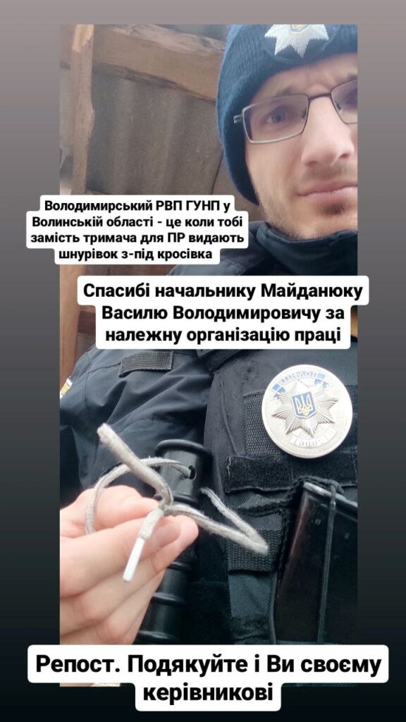 Допис про складні умови праці дільничний Володимирського райвідділу поліції Артем Мартинюк опублікував у Facebook 23 жовтня. Останньою краплею його терпіння стало те, що під час несення служби на блокпосту йому видали спорядження, де замість кільця для гумового кийка була привʼязана шнурівка від кросівка.