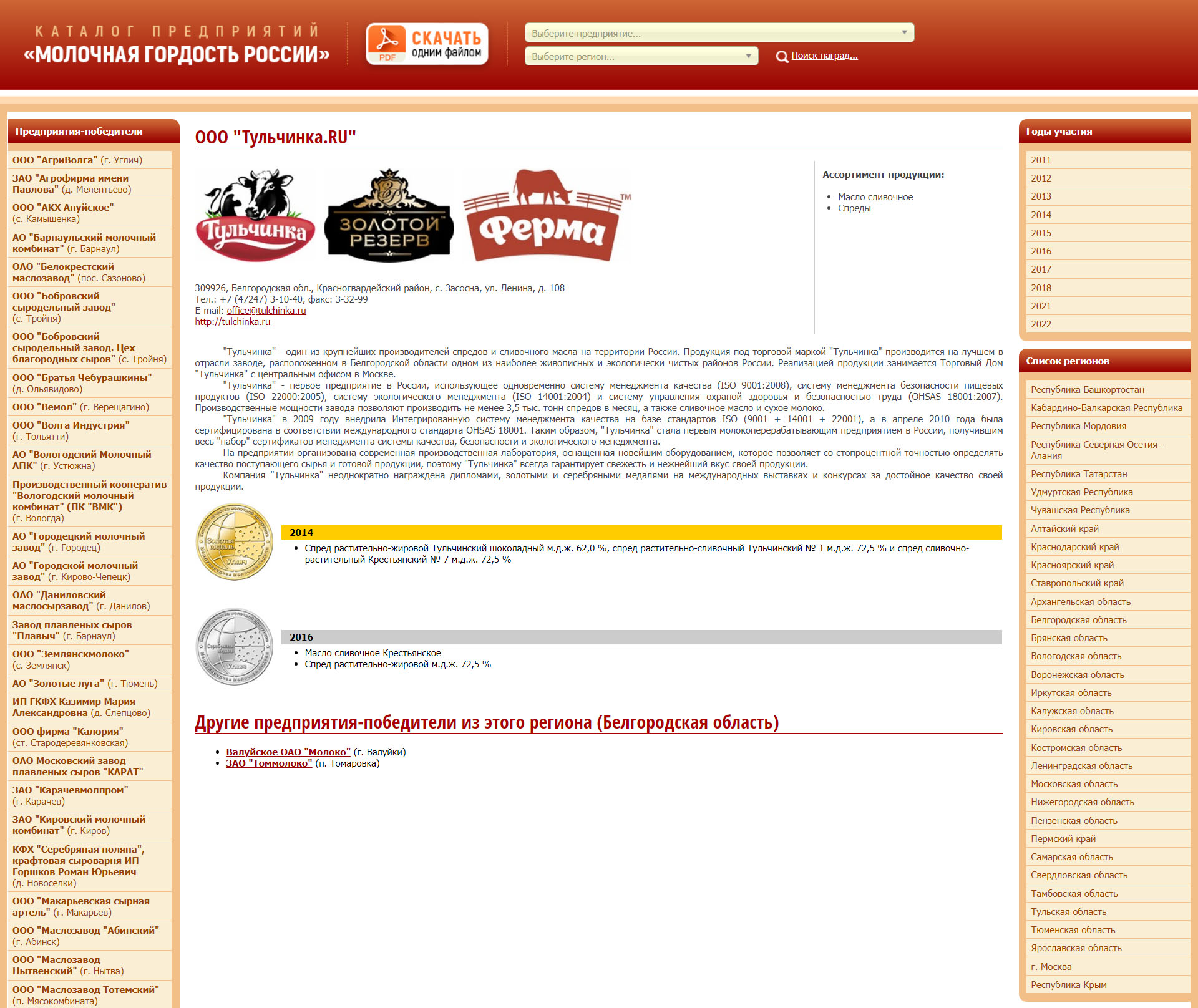 Щонайменше у 2017 та 2020 роках компанія потрапляє у всеросійський довідник «Молочна галузь». За його даними, до речі, у 2020 році завод переробив 10,7 тисяч тонн сировини, виготовивши 14,7 тисяч тонн готової продукції.