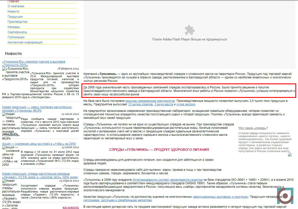 Нині інформації про завод у Засосній, Бєлгородської області РФ на сайті годі й знайти. Проте, в останні роки він продовжує працювати. Про це свідчить участь компанії в щорічний рейтингах «Молочна гордість Росії», де у 2014 та 2016 роках вона отримала нагороди.