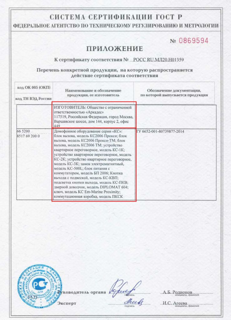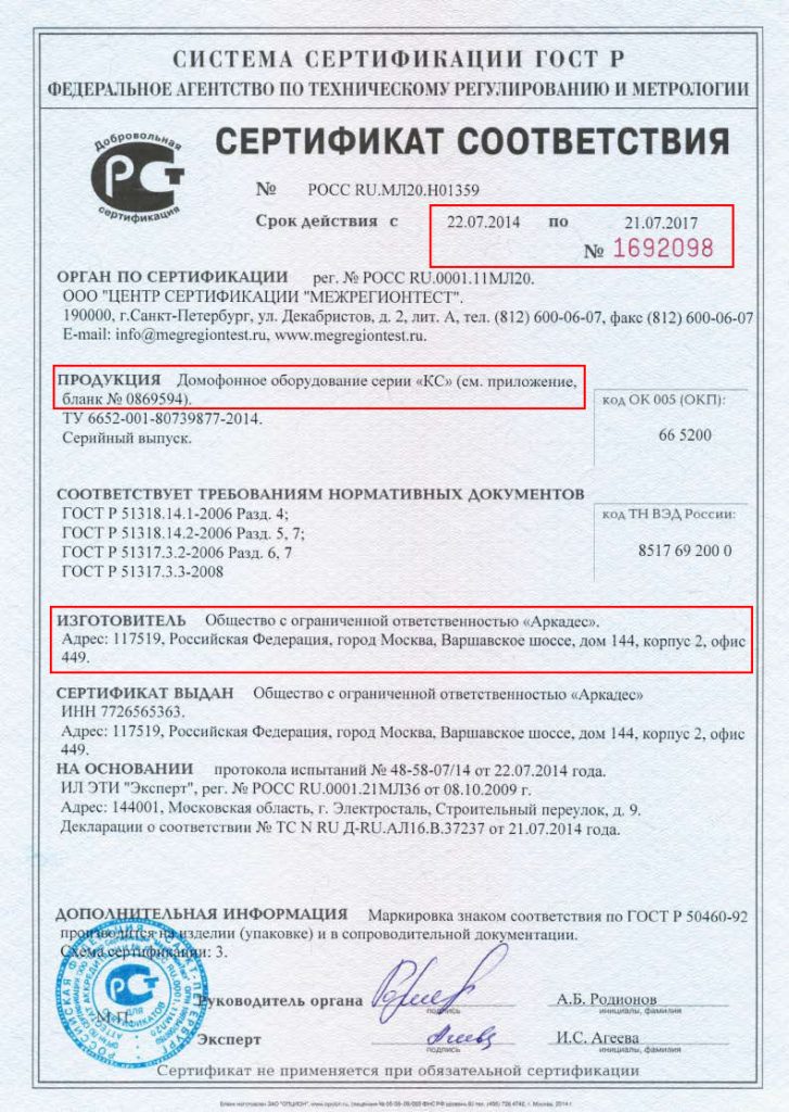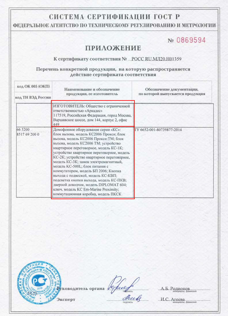Тим не менше, якщо почитати сертифікати відповідності, які опубліковані на сайті російського «КС-Домофон», то можна побачити, що вони видані виробнику систем – російській ТОВ «Аркадес». Фірма зареєстрована у 2008 році у Московській області.