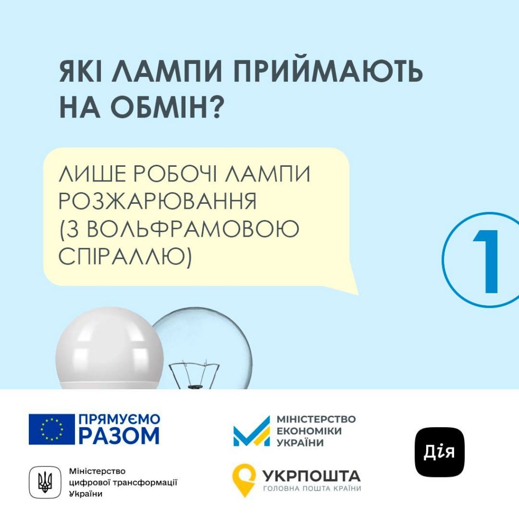 З 30 січня волиняни можуть безплатно обміняти п’ять ламп розжарювання на таку ж кількість LED-ламп. Зробити це можна у будь-якому відділенні «Укрпошти». Проект всеукраїнський і реалізується за підтримки міністерств економіки, цифрової трансформації, цифрового застосунку «Дія» та представництва Європейського Союзу.
