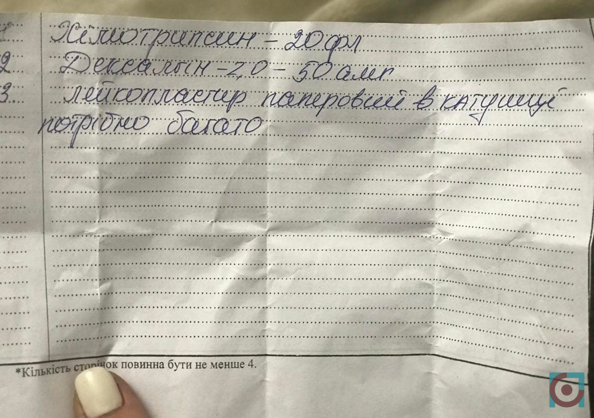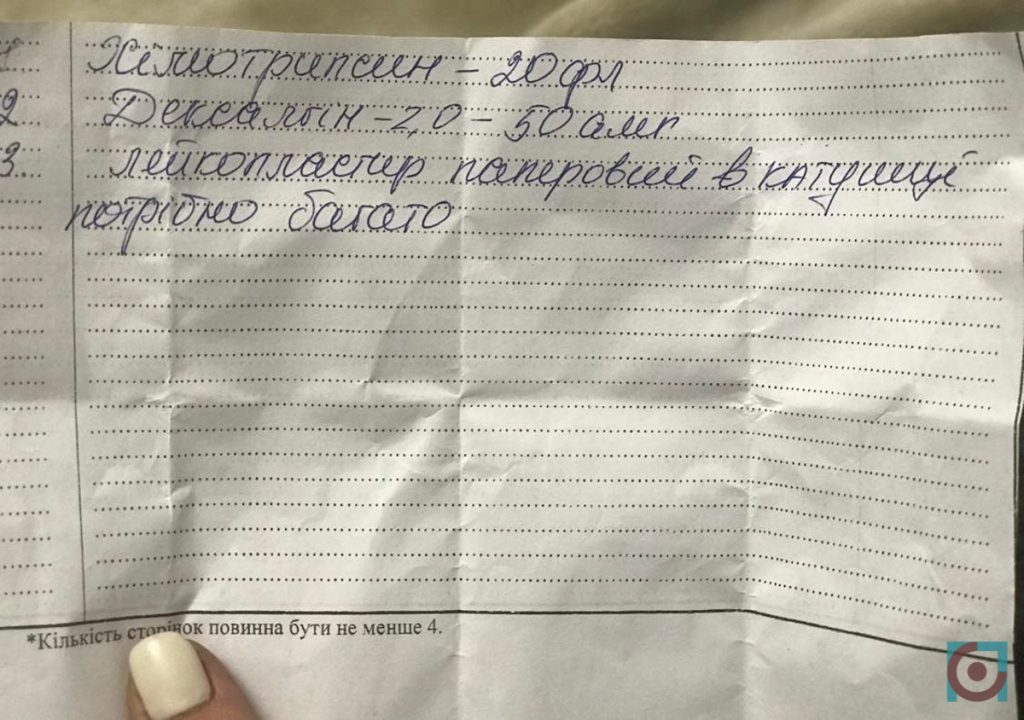 Ще один військовослужбовець, якого ми зустріли біля лікарні, продемонстрував нам свій список медикаментів, які має придбати. Він також лікується в стаціонарі.