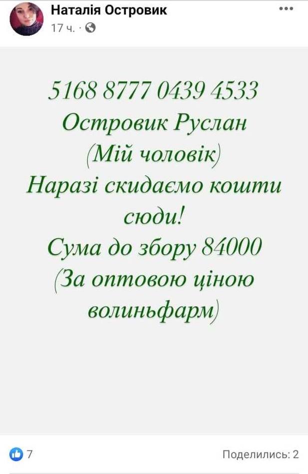 Жінка вирішила допомогти і звернулася до медперсоналу. Старша медична сестра підготувала список медикаментів і дала його волонтерам. Наступного дня, пригадує волонтерка, вона зателефонувала в одну з аптек мережі «Волиньфарм», щоб довідатися, у скільки обійдуться всі ці пігулки. Сума виявилась значною, тому Наталія Островик вирішила організувати збір пожертв через соціальні мережі.