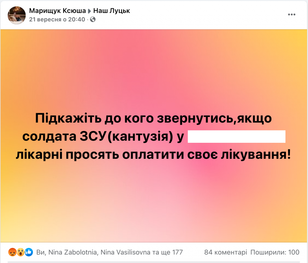 «Підкажіть, до кого звернутися, якщо в солдата ЗСУ з контузією в лікарні просять оплатити своє лікування?»