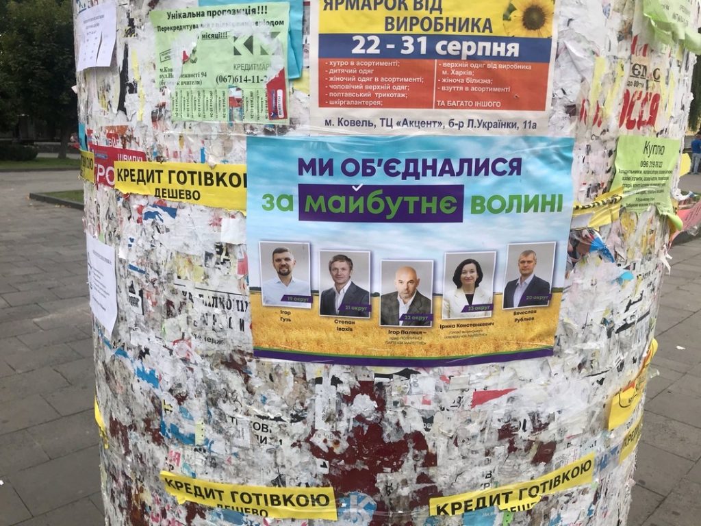 На Волині після початку виборчої кампанії 5 вересня спостерігачі Громадянської мережі ОПОРА зафіксували нові прояви зовнішньої політичної реклами на користь п’яти партій та шести потенційних кандидатів, а заразом і розповсюдження друкованих листівок та газет на користь двох політичних сил та їхніх представників.