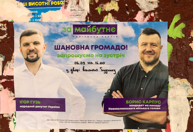 На одній з дошок для розміщення оголошень у місті Нововолинську представники ОПОРИ виявили листівку із зображенням чинного нардепа від округу №19, одного з лідерів партії «За майбутнє» Ігоря Гузя та потенційного кандидата на посаду Нововолинського міського голови від цієї ж партії Бориса Карпуса. Листівка містила логотип партії і текст такого змісту: «Шановна громадо! Запрошуємо на зустріч 06.09. о 16:00 у дворі вашого будинку».