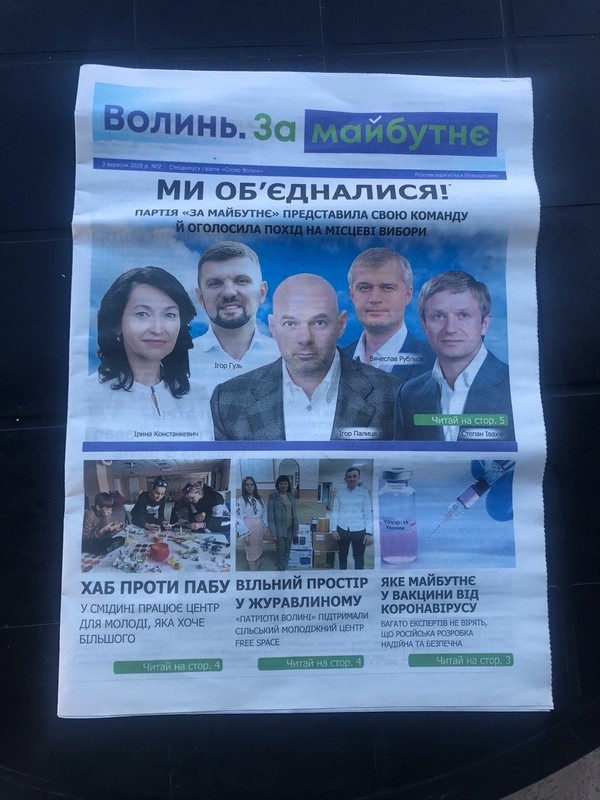 4 вересня, напередодні старту виборчого процесу представник ОПОРИ зафіксував також факт поширення газети на користь партії «За майбутнє» у селищі Шацьк. Активісти розносили партійну пресу «Волинь. За майбутнє» по будинках.