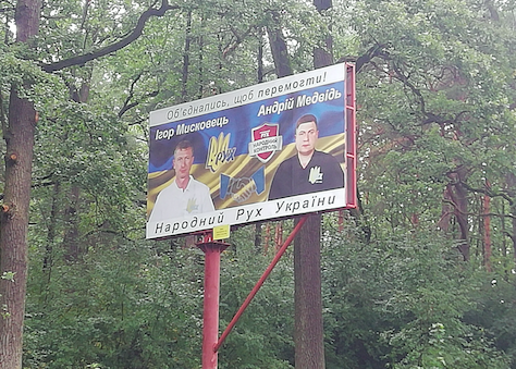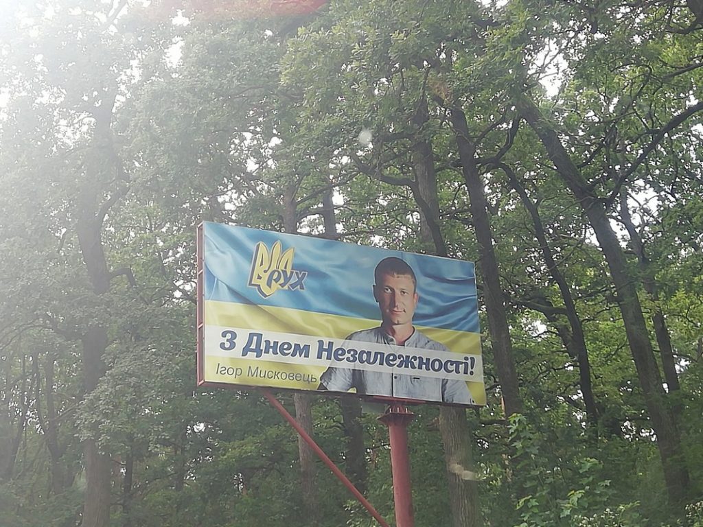 Також поблизу міста Ківерці зафіксували білборд-вітання із Днем Незалежності. На плакаті на тлі прапора розміщене фото та ім’я Ігоря Мисковця – представника Народного Руху України. На іншому борді, виявленому поблизу цього ж населеного пункту, містились зображення двох потенційних кандидатів – Ігоря Мисковця (Народний Рух України) та Андрія Медвідя («Громадський рух «Народний контроль») з гаслом «Об’єднались, щоб перемогти!».