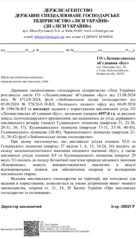 Щоправда, нещодавно у Facebook опублікували документ, яким ДП «Ліси України» погоджує надання у користування 6 тисяч 957 гектарів мисливських угідь громадській організації «Лісомисливське об’єднання «Буг».