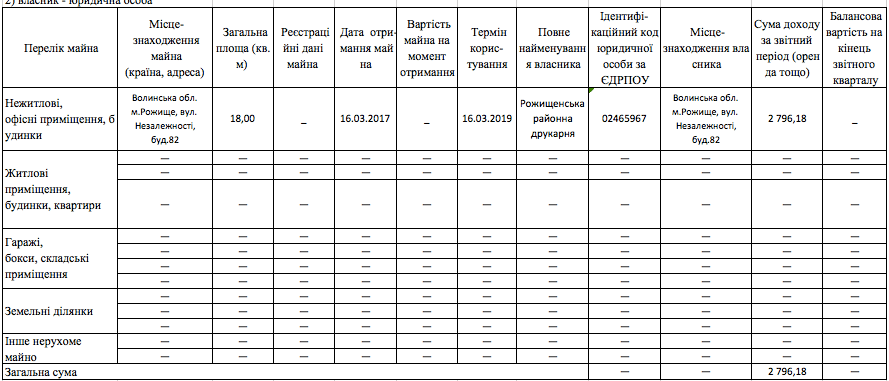 Повертаючись до теми безоплатного користування комунальним майном варто зазначити, що оплатити оренду приміщення в Рожищі один раз на два-три місяці для проведення прийому громадян, для депутата з такими статками цілком посильно. А тим більше, зважаючи на те, що «Батьківщина», згідно з прийнятим у 2015-му році законом, отримує кошти на свою діяльність із державного бюджету.