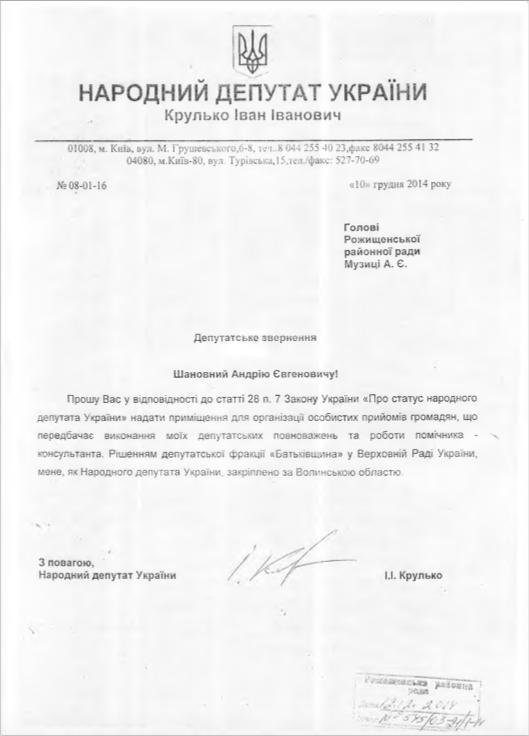 – Крулько особисто звернувся із заявою, в якій просив надати кабінет під громадську приймальню, – розповідає голова Рожищенської районної ради, член «Батьківщини» Андрій Музика. – Відповідно до Закону «Про статус народного депутата» він має право на це. Ми приймали сесійним рішенням. Невиконання закону тягне за собою наслідки. Колись у нас були офіси і Катерини Ващук і ще якогось нардепа від Партії Регіонів. Ми зобов’язані надавати народним депутатам не просто приміщення, а спеціально обладнане приміщення. Наскільки мені відомо, комунальні послуги він відшкодовує, – каже Андрій Музика.