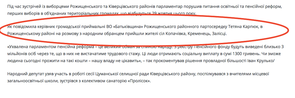 А ось і стаття з сайту волинської «Батьківщини» про візит Івана Крулька в Рожище. Тетяна Карпюк тут згадується як керівниця громадської приймальні районного партосередку «Батьківщини».
