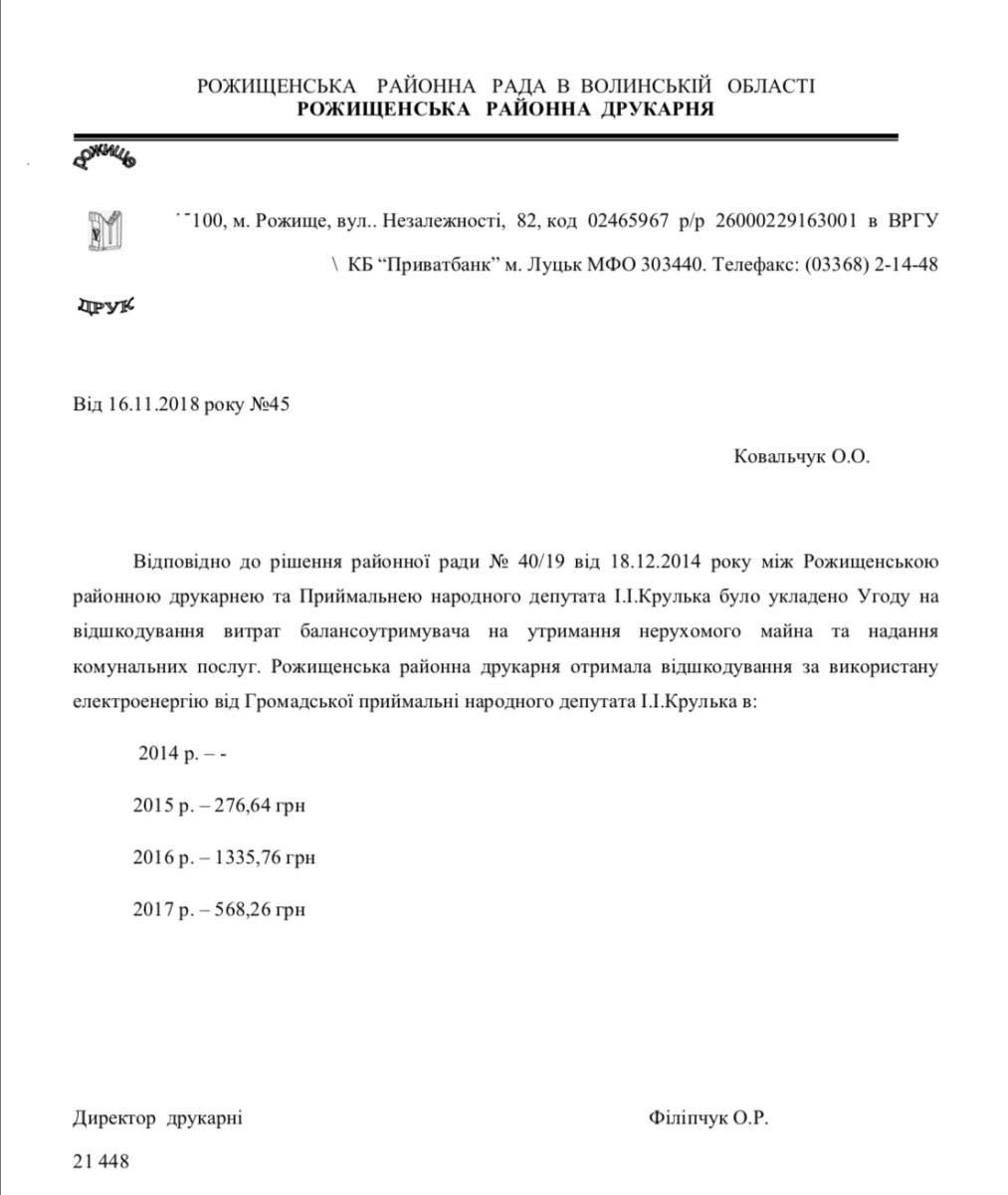 Слова голови райради підтвердили в КП «Рожищенська районна друкарня». Депутат за три роки сплатив комунальних платежів на суму 2180 гривень 66 копійок.