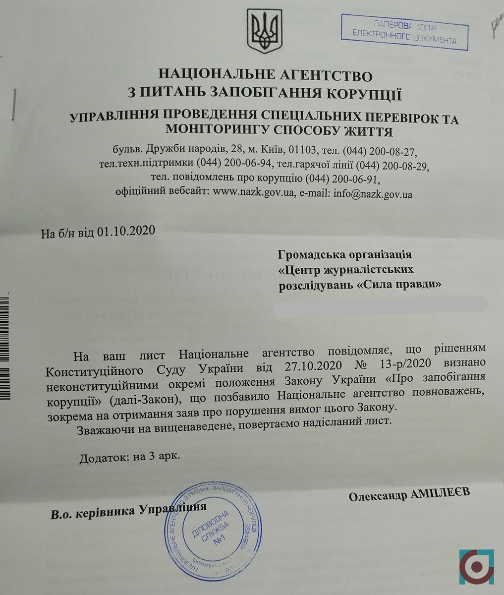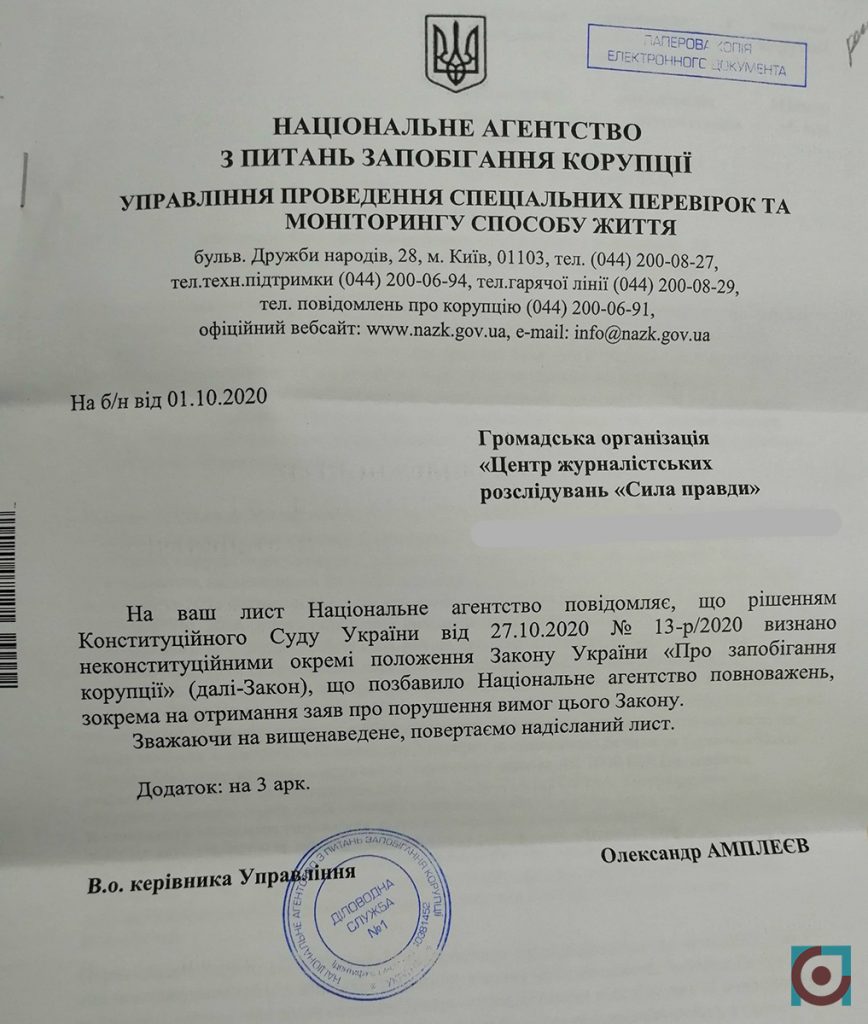 Національне агентство з питань запобігання корупції повернуло заяву Центру журналістських розслідувань «Сила правди» щодо незадекларованого майна головного лісівника Волині Олександра Кватирка. Це сталося після того як 27 жовтня Конституційний Суд визнав неконституційною статтю 366-1 Кримінального кодексу, що передбачала покарання за недостовірне декларування.