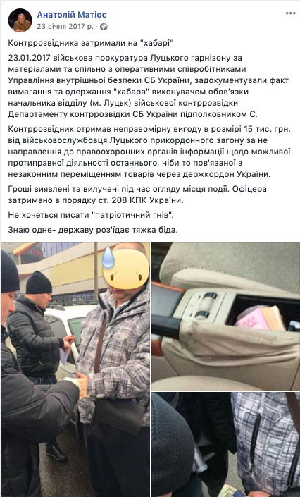 На початку 2017-го у Луцьку затримали полковника контррозвідки Служби безпеки України Анатолія Семенюка. ЗМІ повідомляли, що він отримав 15 тисяч гривень від військовослужбовця Луцького прикордонного загону за не скерування до правоохоронних органів інформації про те, що останній, нібито, допомагав контрабандистам переміщати товари через держкордон. Про вдалу спецоперацію з виявлення «паршивої вівці у стаді» того ж дня відрапортував у «Facebook» головний військовий прокурор України Анатолій Матіос.