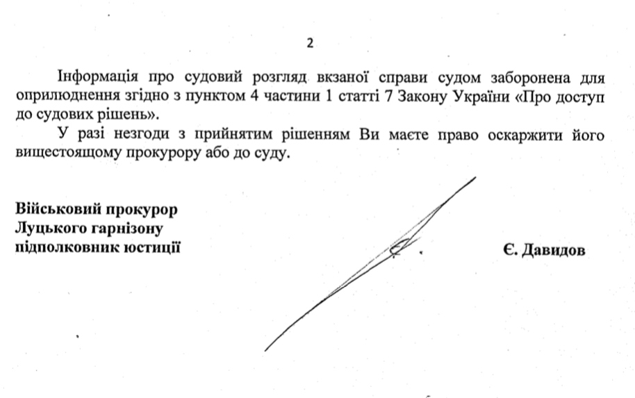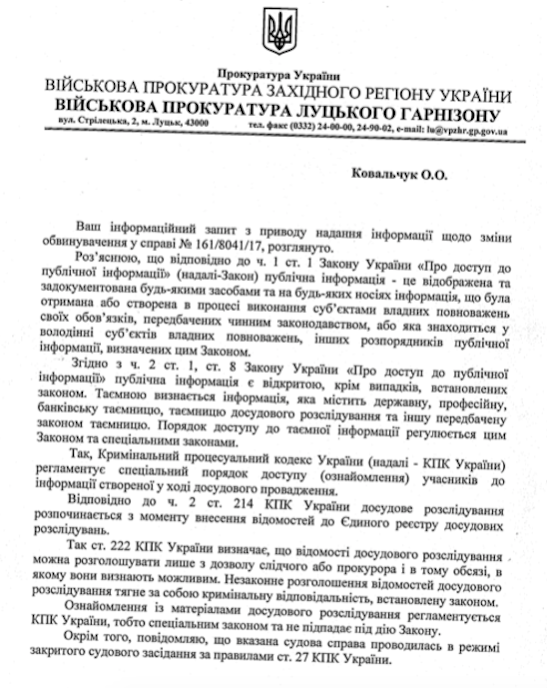 Інформаційний запит про те, чи клопотала військова прокуратура про зміну обвинувачення і на яку статтю перекваліфікували злочин, у Львові «маринували» два дні, за цей час перетворили його з електронної форми у паперову і звичайною поштою надіслали у Луцький гарнізон для відповіді. Лист йшов 5 днів, 4 відлежувався на столах і врешті військовий прокурор Євген Давидов підписав відмову, перевівши стрілки на суд: «Інформація про судовий розгляд вказаної справи судом заборонена до оприлюднення… »