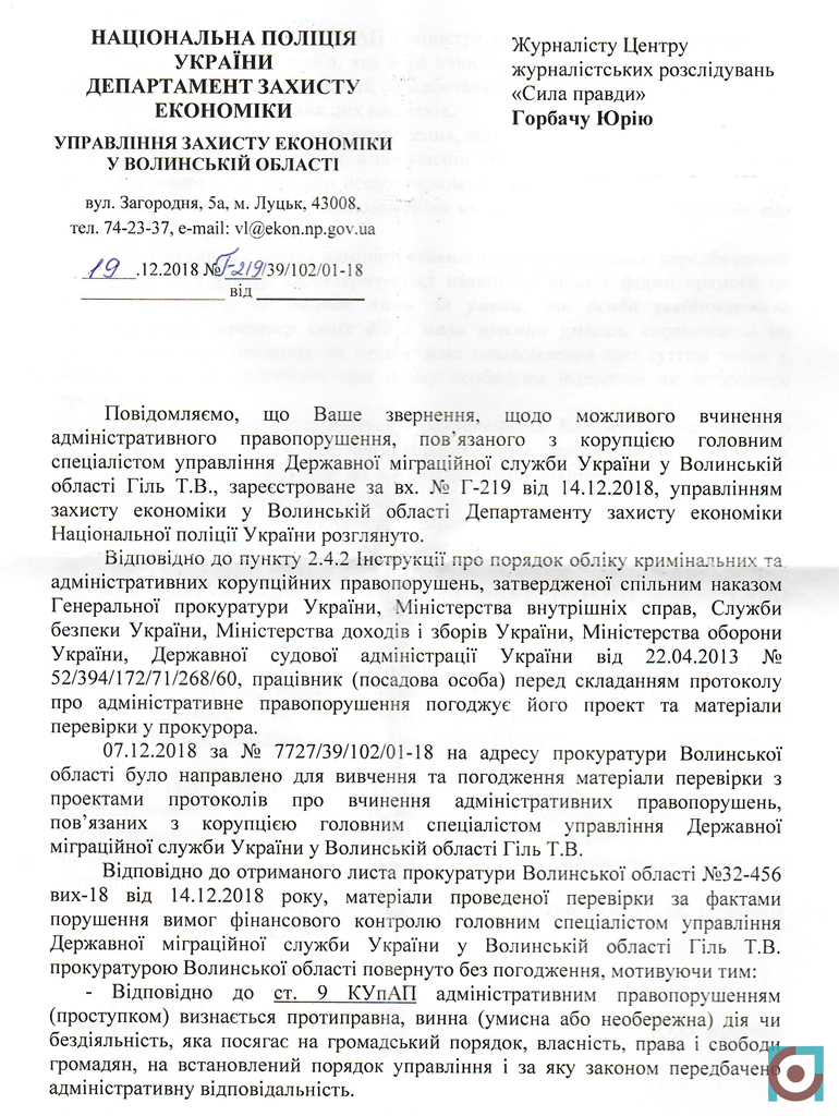 Таку інформацію надали в Управлінні захисту економіки у Волинській області ДЗЕ Національної поліції на звернення Центру журналістських розслідувань «Сила правди» та юристів Громадської організації «Том 14».