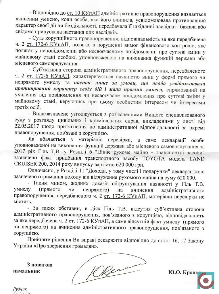 «Суб’єктивна сторона адміністративного правопорушення, передбаченого ч. 2 ст. 172-6 КУпАП, характеризується наявністю вини у формі прямого чи непрямого умислу та настає лише за умови, що особа усвідомлювала протиправний характер своїх дій і мала прямий умисел, спрямований на ухилення від повідомлення чи несвоєчасне повідомлення про суттєві зміни у майновому стані, керуючись при цьому особистим інтересом чи інтересами третіх осіб. (…) Жодних доказів обґрунтування наявності у Гіль Т.В. умислу (прямого чи непрямого) на вчинення адміністративного правопорушення матеріали перевірки не містять. За таких обставин відсутня суб’єктивна сторона адмінправопорушення, пов’язаного з корупцією (…)», – зробили висновок у прокуратурі Волині.