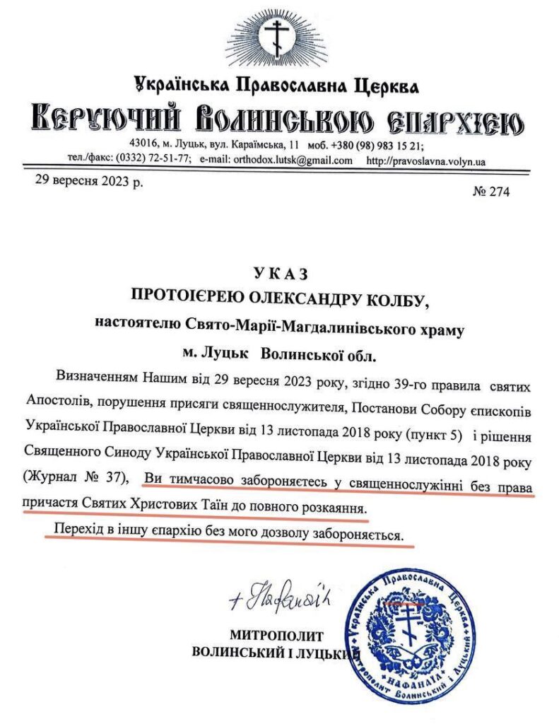 Приміром, настоятель луцької церковної громади Свято-Марії Магдалинівського храму Олександр Колб взагалі отримав таку заборону ще до переходу. Причиною цьому стало співслужіння з представником Константинопольського патріархату.