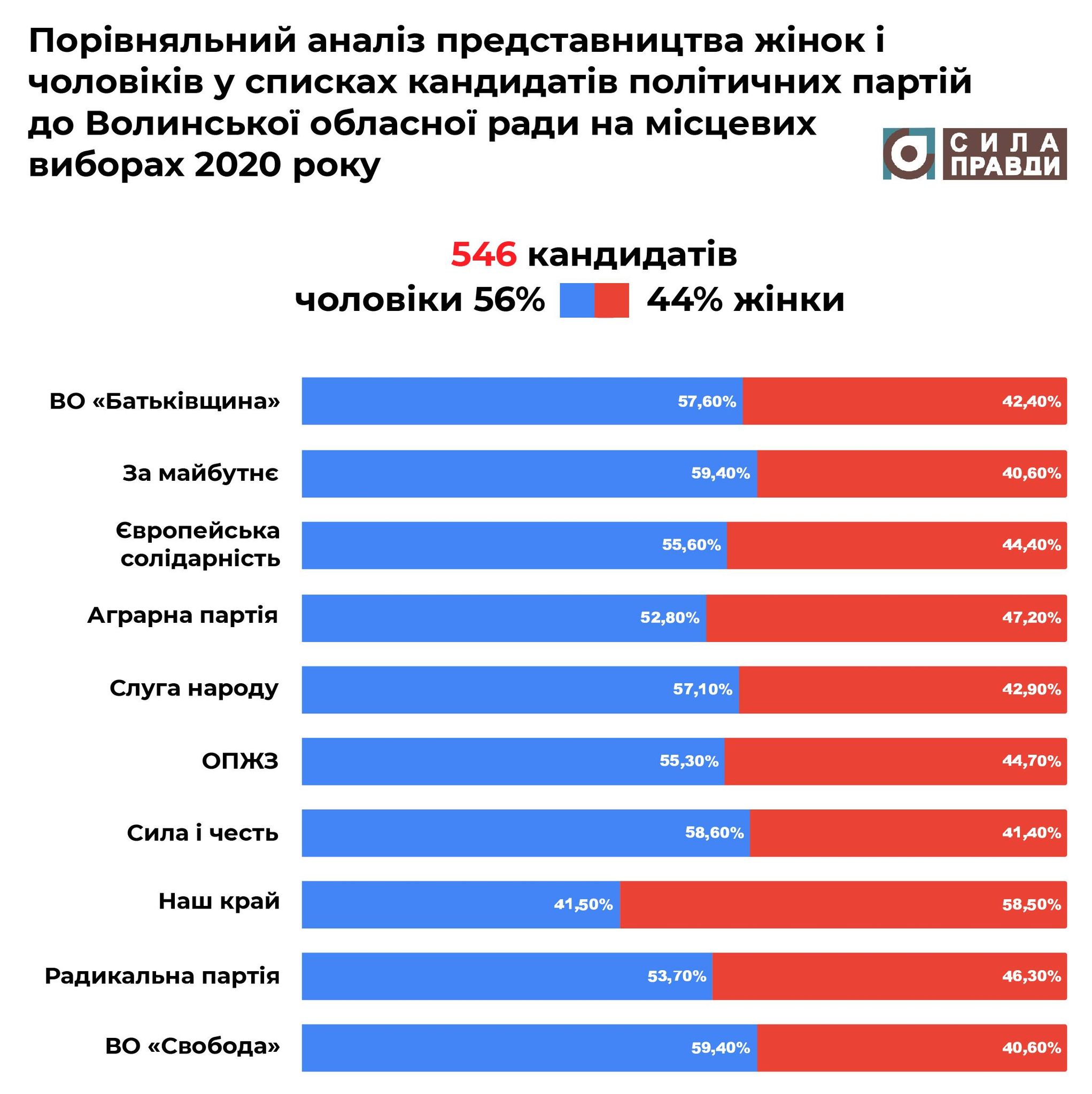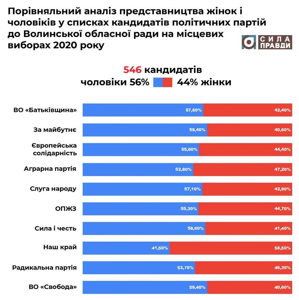 Серед десяти партій, які подали списки кандидатів у депутати Волинської обласної ради, дві партії не дотримались гендерної квоти. Це партія «Опозиційна платформа – За життя» та «Сила і честь». В останній кажуть, що це трапилось через механічну помилку.