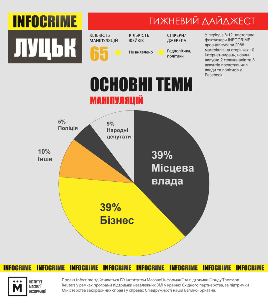 Такі результати отримала команда проєкту «Infocrime Lutsk» в результаті щотижневого моніторингу інформаційного простору за підтримки британського фонду Thompson Reuters, у партнерстві з Інститутом масової інформації.