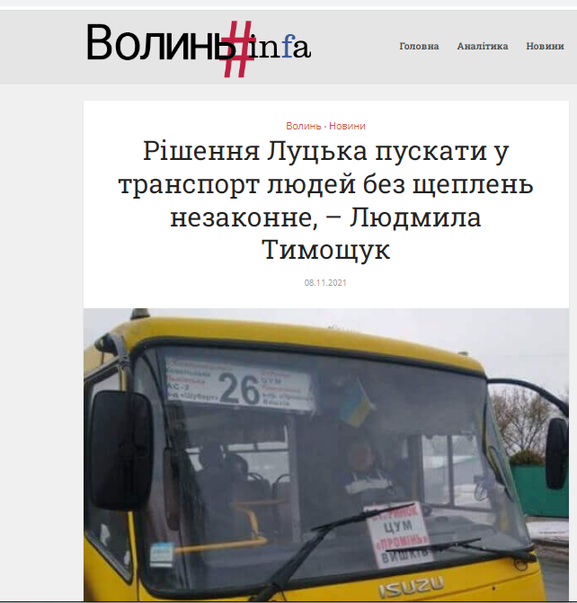 На сайті «Волинь#Інфа» є маніпуляція в заголовку «Рішення Луцька пускати у транспорт людей без щеплень незаконне», – Людмила Тимощук». Насправді, у Міністерстві охорони здоров’я України не забороняли їздити невакцинованим у громадському транспорті.