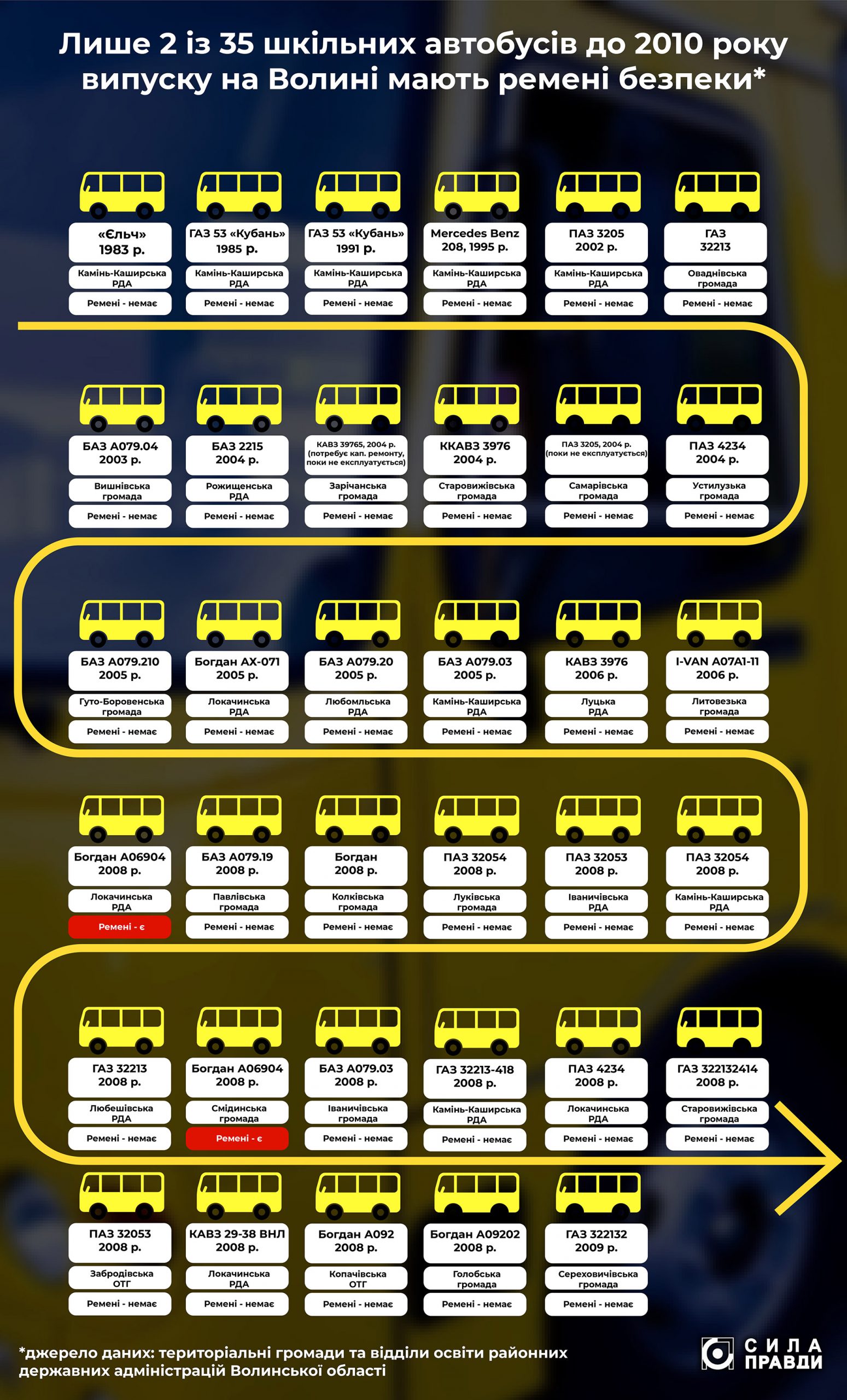 Ми написали запити в громади Волині та відділи освіти райдержадміністрацій, аби дізнатися якого року випуску автобуси, що перевозять дітей. Отож, щонайменше 35 транспортних засобів (16% усіх шкільних автобусів в області) випущені до 2010-го року. Є й кілька машин, які підвозили до школи не лише дітей, а й їхніх батьків, – ці автобуси складали ще у 80-их.