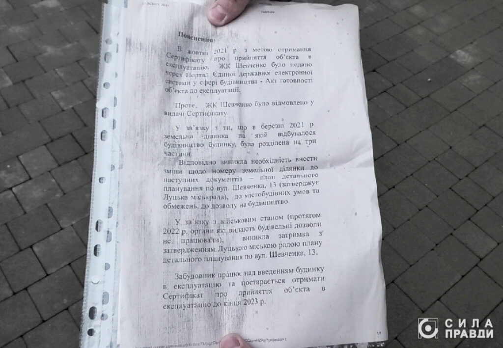 «У зв’язку з військовим станом виникла затримка із затвердженням Луцькою міською радою плану детального планування по вул. Шевченка, 13. Забудовник працює над введенням будинку в експлуатацію і постарається отримати сертифікат про прийняття об’єкта в експлуатацію до кінця 2023 року», – йдеться у листі.