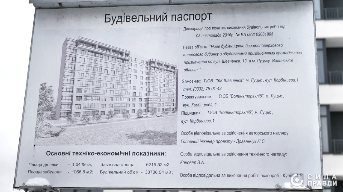 Згідно з даними Реєстру будівельної діяльності, у травні 2022 року ТОВ «ЖК Шевченка» звернулося до відділу державного архітектурно-будівельного контролю Луцької міської ради щодо прийняття об’єкта будівництва в експлуатацію. Однак, забудовник отримав відмову. Інспектор архбудконтролю виявив суттєві розбіжності з проєктом будівництва щодо площі будівлі, її висоти та кількості поверхів. Більше того, підприємство не мало чинних містобудівних умов та обмежень. Документ, який фактично є дозволом на будівництво, компанія «ЖК Шевченка» отримала у 2016 році, а у 2021 році його скасували внаслідок поділу земельної ділянки. Нові ж містобудівні умови та обмеження фірмі так і не видали.