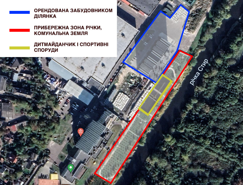 Також забудовник допустив порушення, які стосуються благоустрою прибудинкової території. Зона барбекю, дитячий і спортивний майданчики компанія облаштувала за межами призначеної для будівництва орендованої ділянки, тобто фактично на комунальній землі, яка є набережною річки Стир.