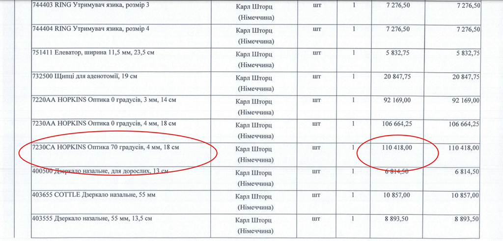 Про те, скільки коштує той, чи інший інструмент з придбаного набору вдалося дізнатися не відразу. У договорі про закупівлю, укладеному 7 жовтня, було вказано лише ціну за весь лот – 4,94 мільйона гривень. Щоб вказати вартість кожної із понад 100 позицій сторони 22 жовтня уклали додаткову угоду з більш детальною специфікацією.