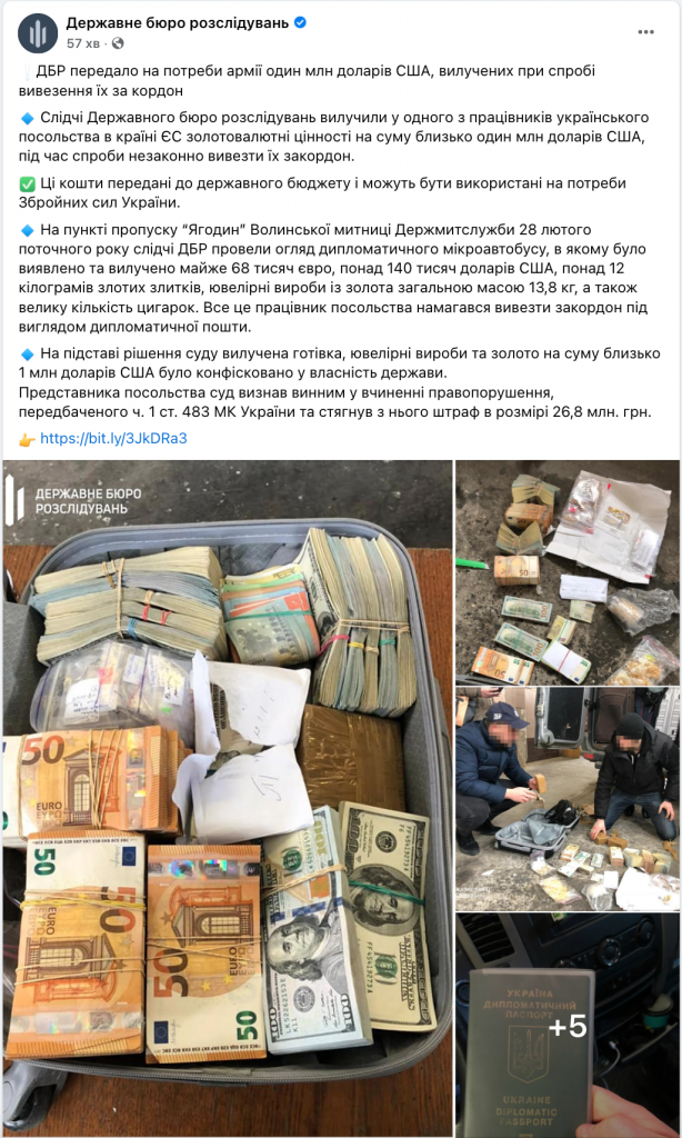 ДБР передало на потреби армії один мільйон доларів США, вилучених при спробі вивозу їх за кордон. Така новина з’явилася на сайті відомства 16 березня 2022 року. У повідомленні зокрема йдеться, що «28 лютого поточного року слідчі ДБР провели огляд дипломатичного мікроавтобусу, в якому було виявлено та вилучено майже 68 тисяч євро, понад 140 тисяч доларів США, понад 12 кілограмів золотих злитків, ювелірні вироби із золота загальною масою 13,8 кг, а також велику кількість цигарок. Все це працівник посольства намагався вивезти за кордон під виглядом дипломатичної пошти».