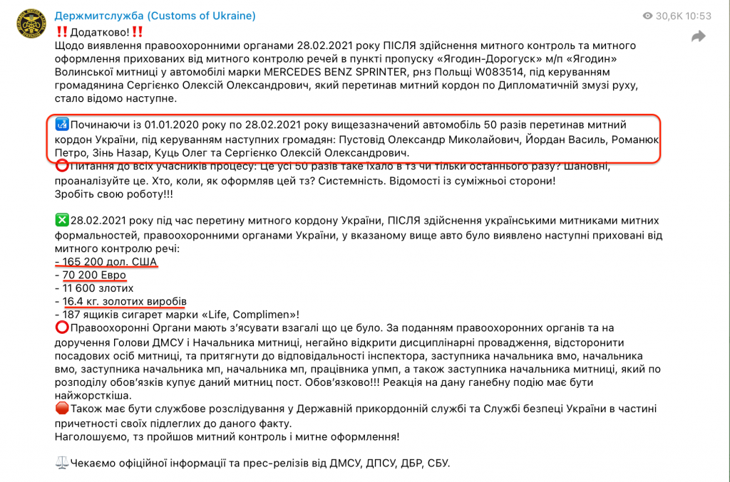«Кінцеве рішення щодо конфіскації золотовалютних цінностей, які працівники ДБР вилучили у лютому минулого року на пункті пропуску «Ягодин» суд ухвалив у березні цього року. Раніше розпоряджатися цими цінностями не можна було, а рішення суду дозволило передати їх державі. Ці кошти передані до державного бюджету і можуть бути використані на потреби Збройних Сил України», – повідомила прес-служба Державного бюро розслідувань.