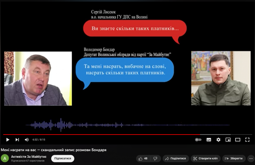 Другого листопада у соцмережах YouTube та Facebook на анонімних сторінках без контактних даних з’явився аудіозапис розмови Сергія Лисеюка та депутата Володимира Бондаря, зроблений у кабінеті голови Волинської облради. Фрагменти цього відеозапису разом із маніпулятивною підводкою опублікували, щоб скомпрометувати Володимира Бондаря. Проте депутат стверджує, що цей запис був зроблений приховано.