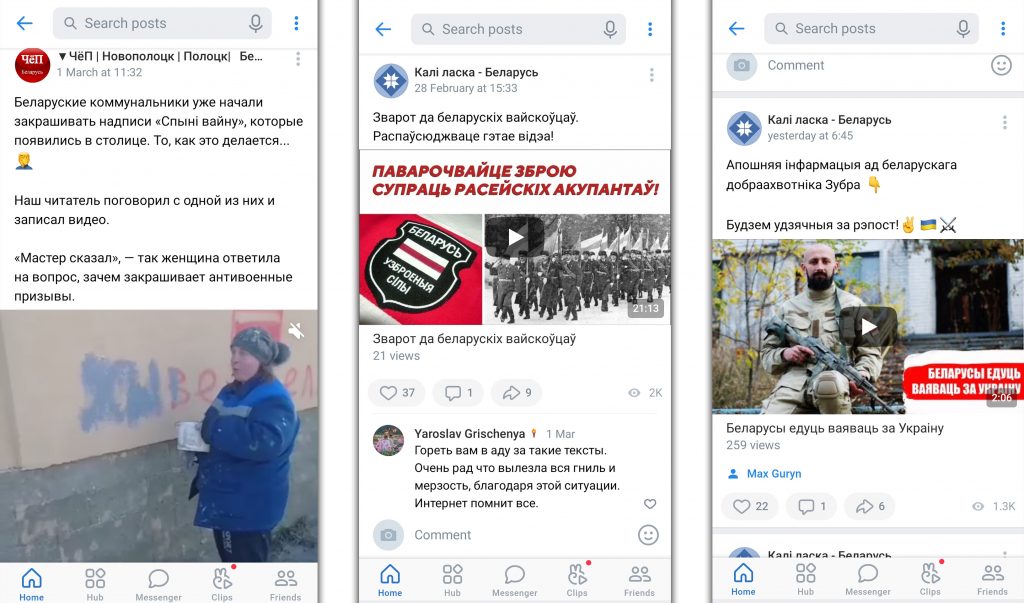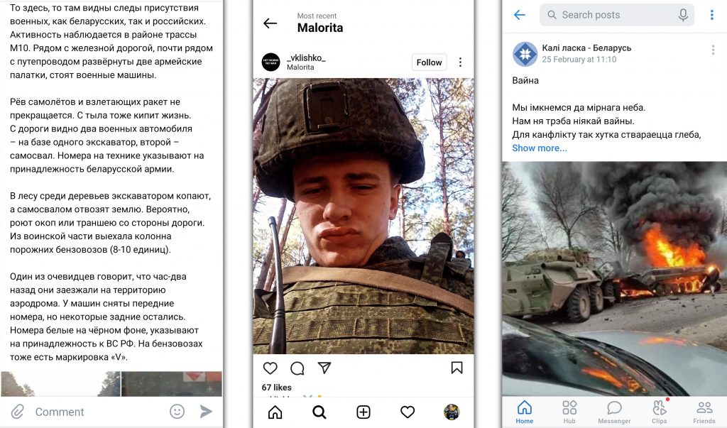 Тим не менш, частина користувачів соцмереж виступили не тільки із критикою влади, але і з закликами боротися проти окупантів. Цей протест проявляється у різних формах: у окремих групах поширювали відео-послання від білоруських добровольців, які воюють на боці України, в містах робили антивоєнні написи на стінах. Навіть окремі військові дозволили собі поставити на аватар у соцмережах заклик “нєт войнє”.
