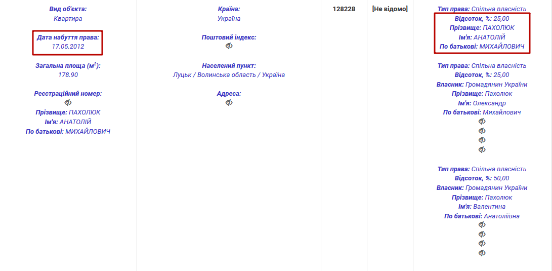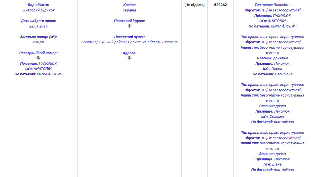 Наприклад у 2017 році суддя задекларував 25% власності квартири в Луцьку, площею 178 кв.м. Отримав він право власності у 2012 році, а тому мав би вказати це житло і у деклараціях за 2012-2014 роки. Проте цього Анатолій Пахолюк не зробив. Та його мати Валентина Пахолюк, яка також донедавна була суддею і є співвласницею квартири – у своїй декларації за 2014 рік цю нерухомість вказала.