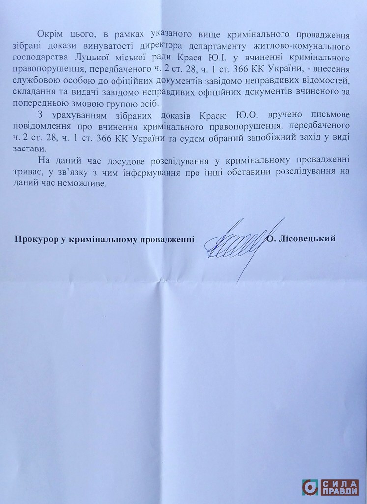 «В рамках кримінального провадження зібрані докази винуватості директора Департаменту житлово-комунального господарства Луцької міської ради Крася Ю.І. у вчиненні кримінального правопорушення передбаченого ч.2 ст.28, ч. 1 ст. 366 КК України (внесення службовою особою до офіційних документів завідомо неправдивих відомостей, складання та видачі завідомо неправдивих офіційних документів вчиненого за попередньою змовою групою осіб). З урахуванням зібраних доказів Красю Ю.І. вручено письмове повідомлення про вчинення кримінального правопорушення […] та судом обраний запобіжний захід у виді застави», – йдеться у письмовій відповіді прокурора Олега Лісовецького.