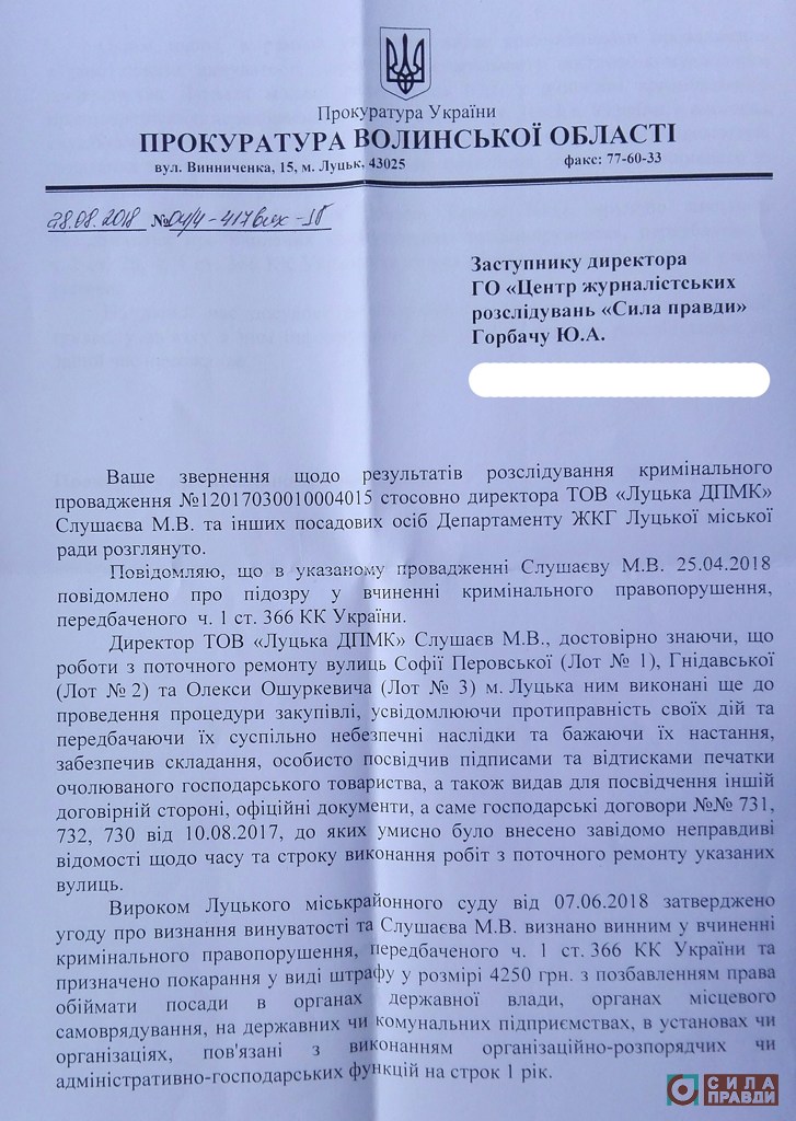 Тим часом, у вироку немає нічого про відповідальність посадовців і директора Департаменту ЖКГ Луцькради, які фактично сприяли в підробці офіційних документів. З’ясувати чому ми спробували у прокурора Олега Лісовецького, який вів цю справу.