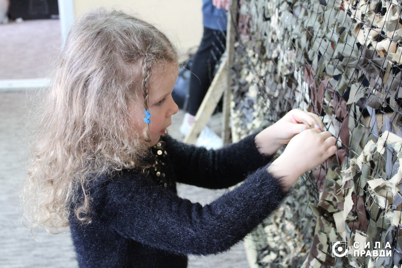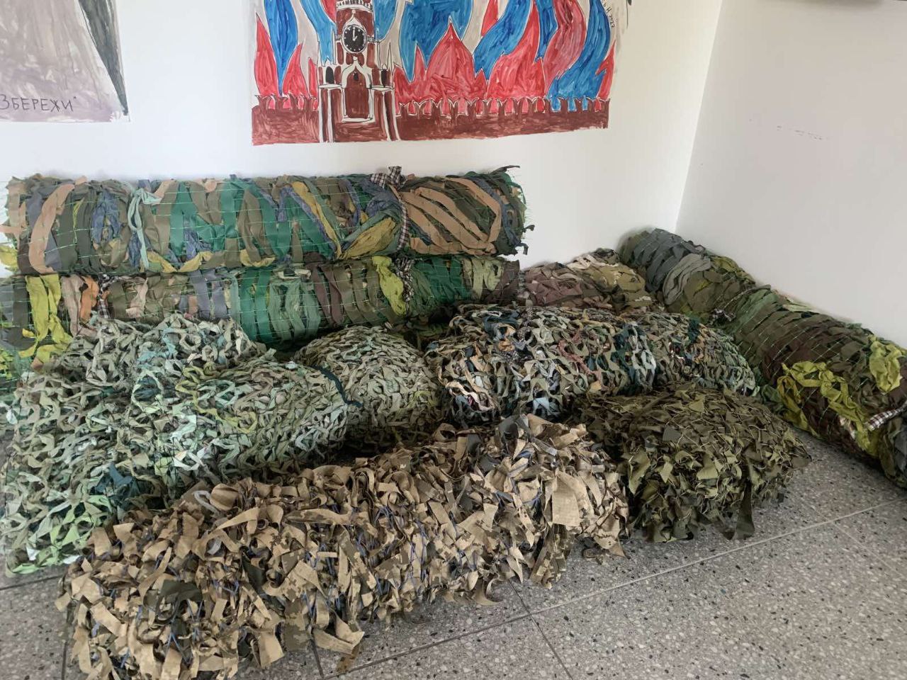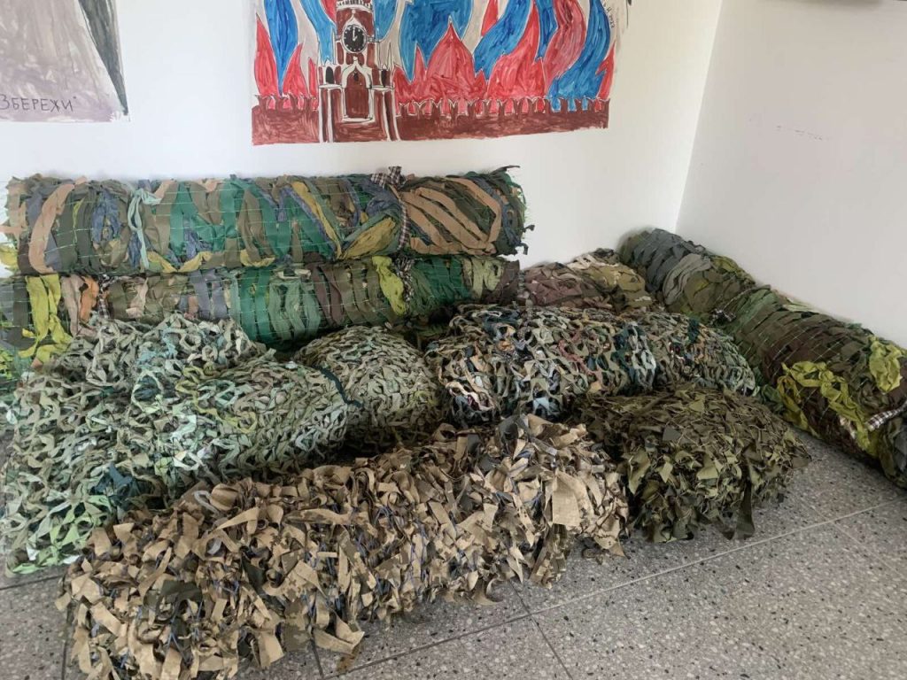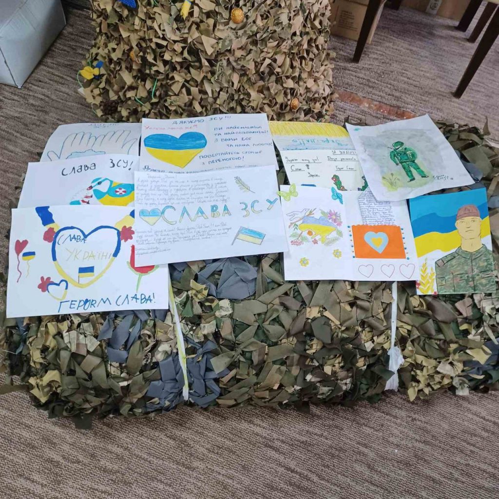 Біля готових до відправки на фронт сіток лежать дитячі малюнки.
