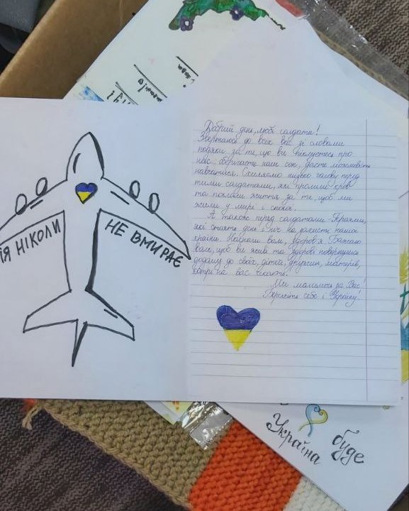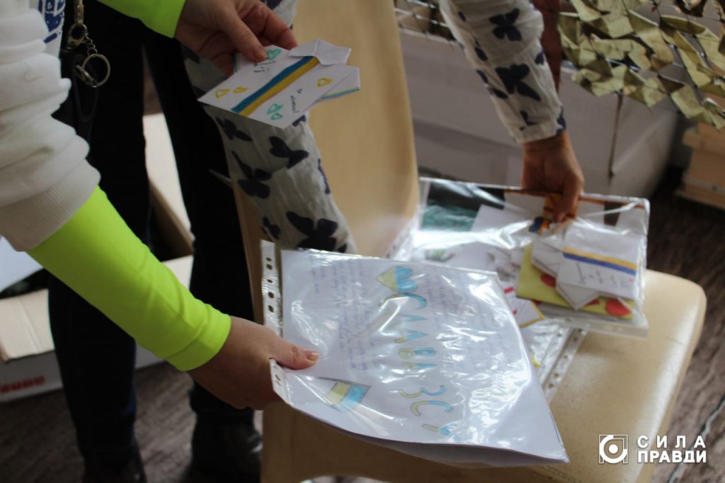 «Малюнки нам приносять діти із шкіл та садочків. Багато в кого тато чи мама перебувають на фронті і діти пропускають все це через себе. Тому з душею малюють, і, навіть, додають листи, які неможливо читати без сліз. До сіток ми ще додаємо янголів-мотанок, зроблених своїми руками. Також час від часу купуємо в церкві невеликі іконки, їх також кладемо як оберіг», – пояснює волонтерка Оксана.