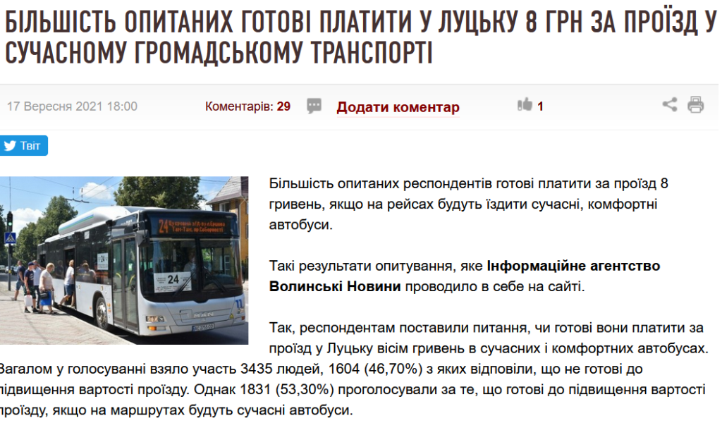 Прикладом такого заголовку на цьому моніторинговому тижні є заголовок новини на сайті ІА «Волинські новини» — «Більшість опитаних готові платити у Луцьку 8 грн за проїзд у сучасному громадському транспорті». Однак, в тексті не йде мова про якесь велике дослідження чи соціологічне опитування з врахуванням думки необхідної, репрезентативної кількості лучан. Йдеться про опитування, яке відбувалось на самому сайті ІА «Волинські новини». Повідомляють, що у голосуванні взяли участь 3435 людей. Проте подібні опитування не є репрезентативними, не показують думку більшості, а лише думку тих, хто читає цей сайт і бажає залишати там свою думку.
