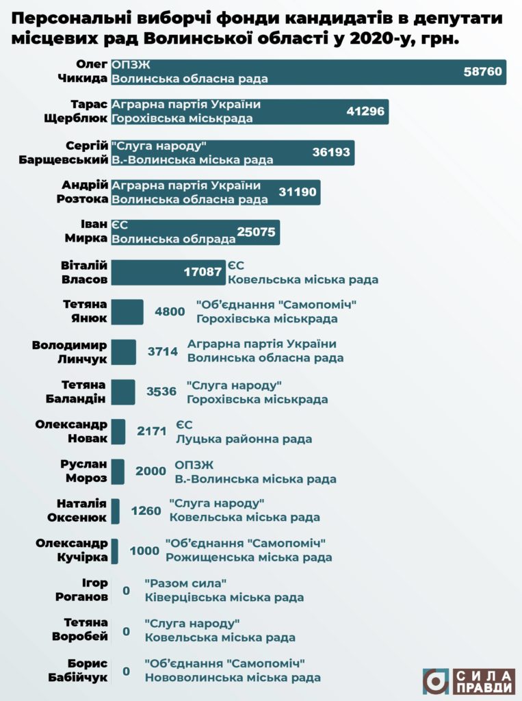 На виборах до Волинської обласної ради виборчі фонди створювали не тільки партії, а й четверо кандидатів: висуванець «Опозиційної платформи – За життя» Олег Чикида, Іван Мирка з «ЄС», Андрій Розтока та Володимир Линчук від Аграрної партії України. Лише один кандидат подав і проміжний, і остаточний фінансові звіти. Це Олег Чикида з ОПЗЖ. Троє інших відзвітувались лише за половину кампанії.