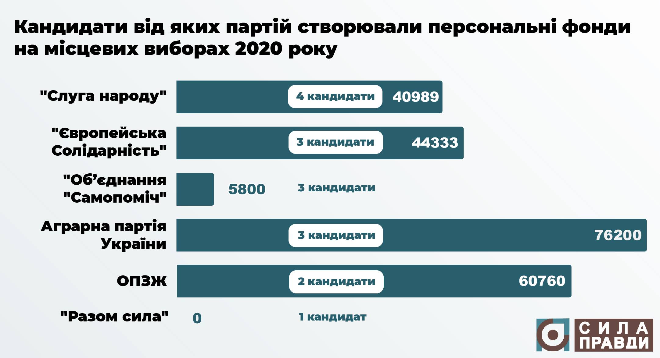 Персональні виборчі фонди створили четверо висуванців партії «Слуга народу», по три — від «Європейської Солідарності», Об’єднання «Самопоміч» і Аграрної партії України, двоє — від «Опозиційної платформи — За життя», один кандидат — від партії «Разом сила».