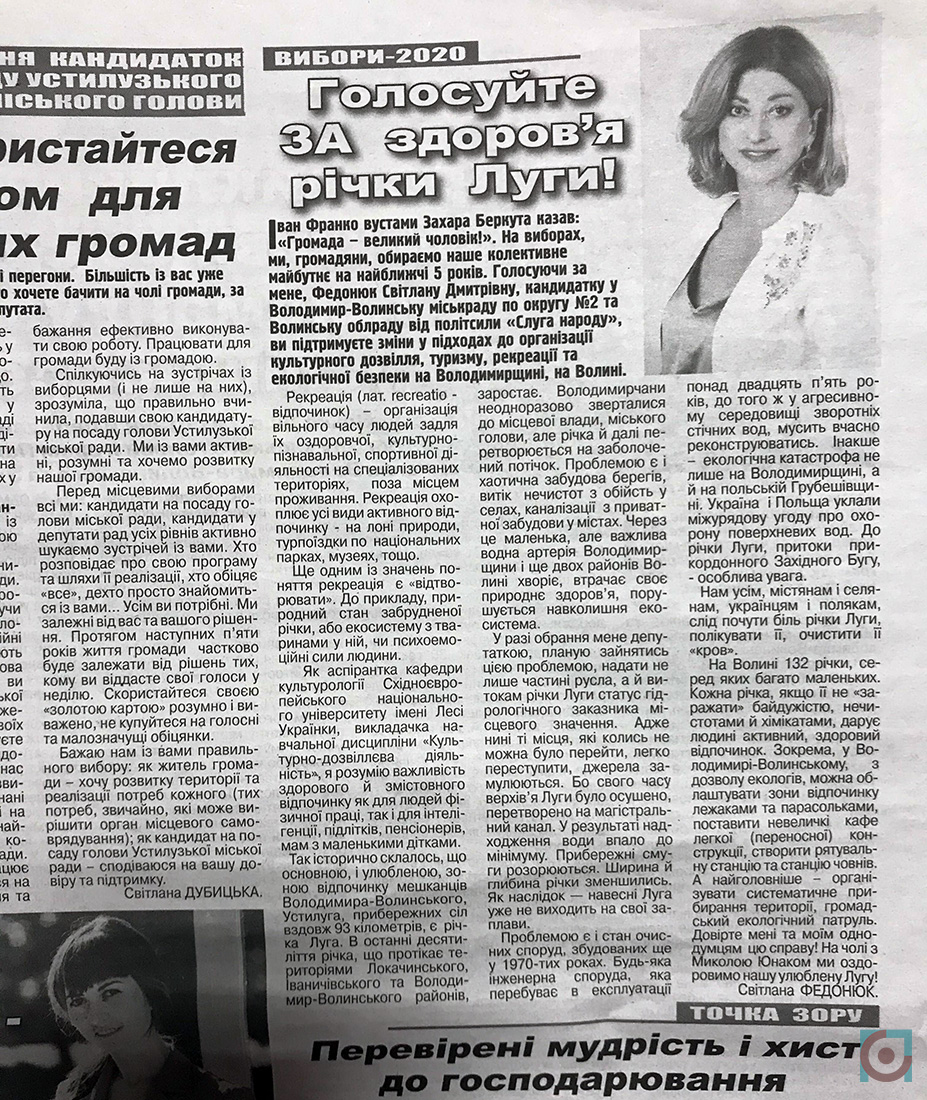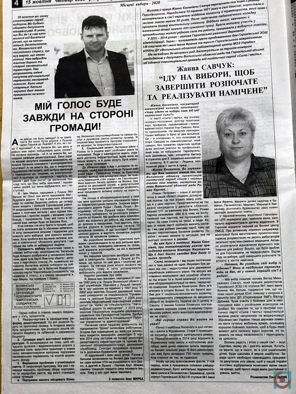 «Слуга народу» Тетяна Баландін витратила на виборах усього 3 тисячі 536 гривень. Усі пішли на оплату друкованої площі в тій же районці «Горохівський вісник».
