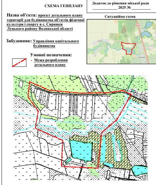 Луцька міська рада погодила розробку плану території у селі Сирники Луцького району з тим, щоб у майбутньому приватний інвестор міг звести там спортивно-тренувальний комплекс. Йдеться про ділянку площею від 30 гектарів.